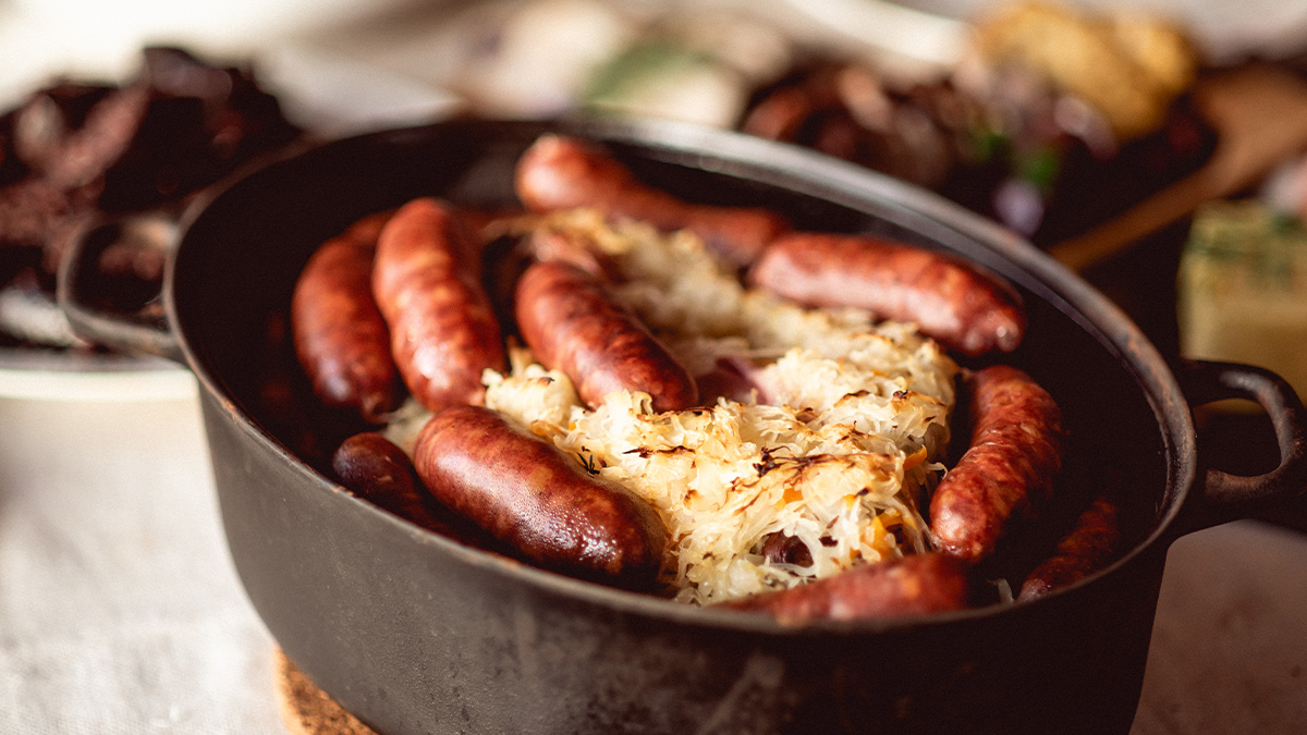 6. Pārlej lej sauso vīnu un 200 ml ūdens. Sautē zem vāka 180°C 2,5 stundas. Pievieno desiņas un turpina sautēt vēl 30 min.